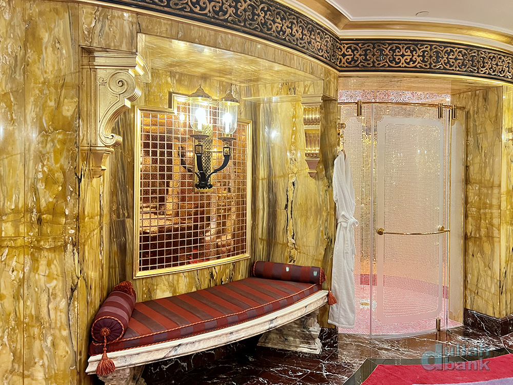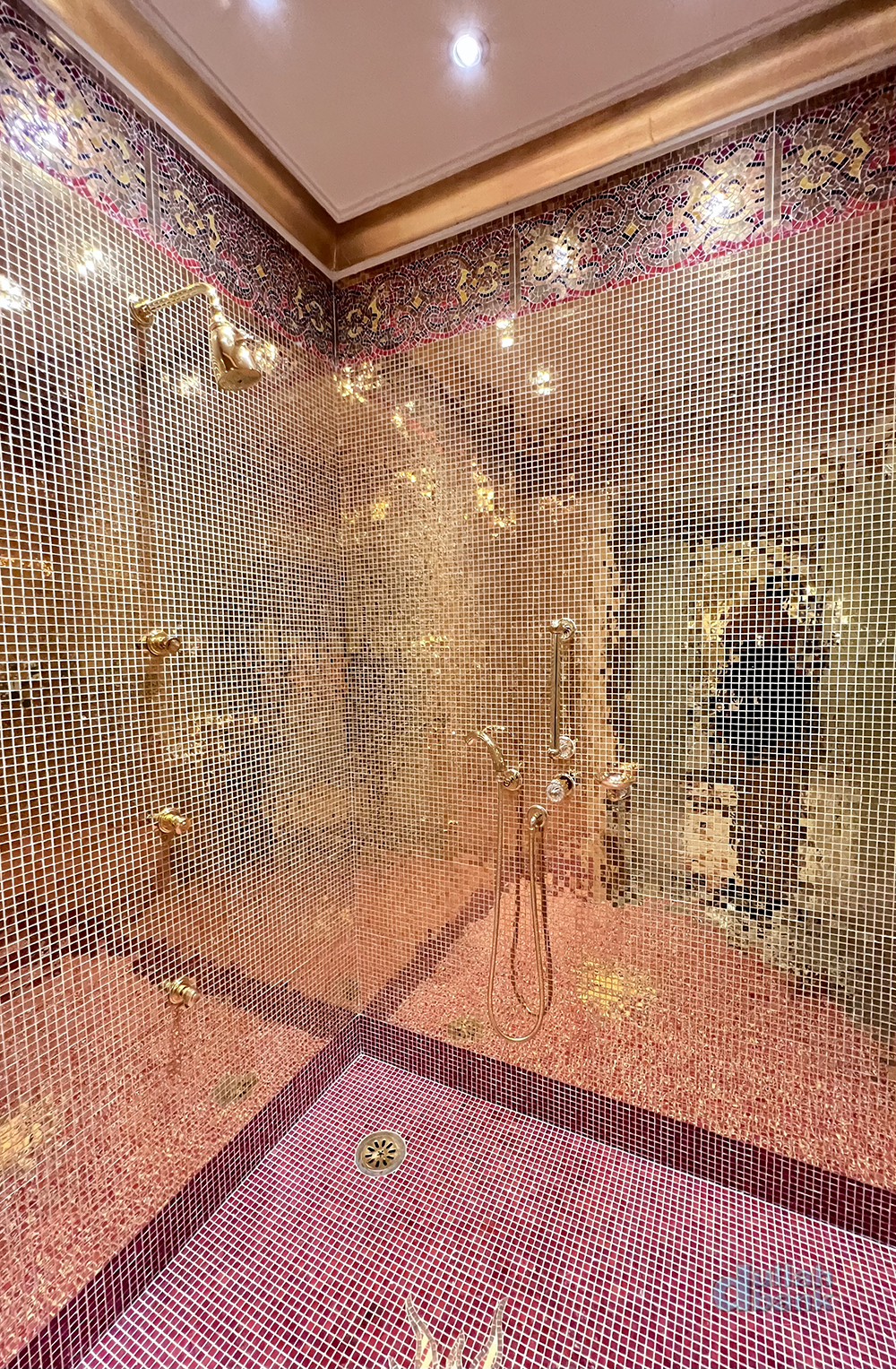 24K순금 타일로 벽을 마감한 샤워실.