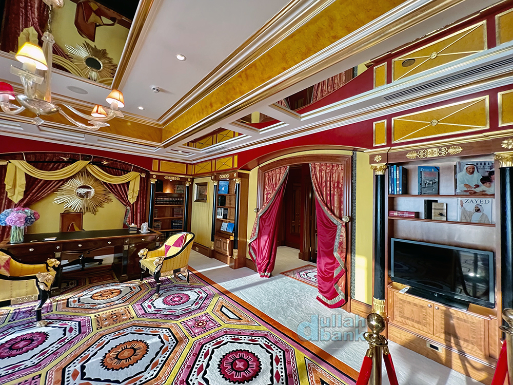 방 전체의 요란하고 화려한 색감은 셰이크 무함마드의 의중이 많이 반영된 결과물입니다. 주메이라 그룹이 부르즈 알아랍과 주메이라 비치 호텔을 짓고 있던 당시 40대 후반의 셰이크 무함마드 왕세제는 자신이 진행하는 첫 대형 프로젝트였던만큼 건설 현장을 시시때때로 찾아 진행상황을 확인하는 등 깊이 관여했다고 합니다. 당시 그를 모시는 곳에 있던 지인에 따르면 그가 새벽 2~3시에 불시에 현장을 방문할 때도 프로토콜에 따라 준비한 후 그를 맞이해야만 했기 때문에 수행직원들은 밤낮을 가리지 않고 긴장 상태였다고 하죠. 과장이 심하다 싶겠지만, 이런 그의 관리 스타일은 나이를 먹고 두바이 통치자가 된 후에도 이어져서 이른 아침 7시대에 두바이 정부 산하 사무실을 불시 시찰했다가 사무실에 아직 출근하지 않은 고위 관료들을 바로 해고시킨 바도 있습니다. 이르긴해도 출근시간이 지나 사무실을 방문했더니 벽에 걸린 자신의 초상화만이 자신을 맞이하고 있었다며 말아죠…