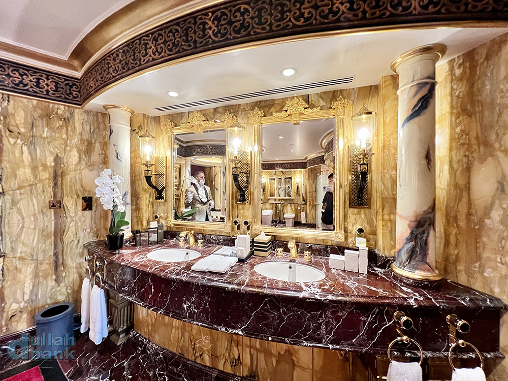 퀸스 베드룸이라고 불리는 방 답게 세면대 옆에 전용 화장대가 있습니다. 이 공간을 대리석으로 심리스하게 설계하는데만 6개월이 걸렸다고 하네요.