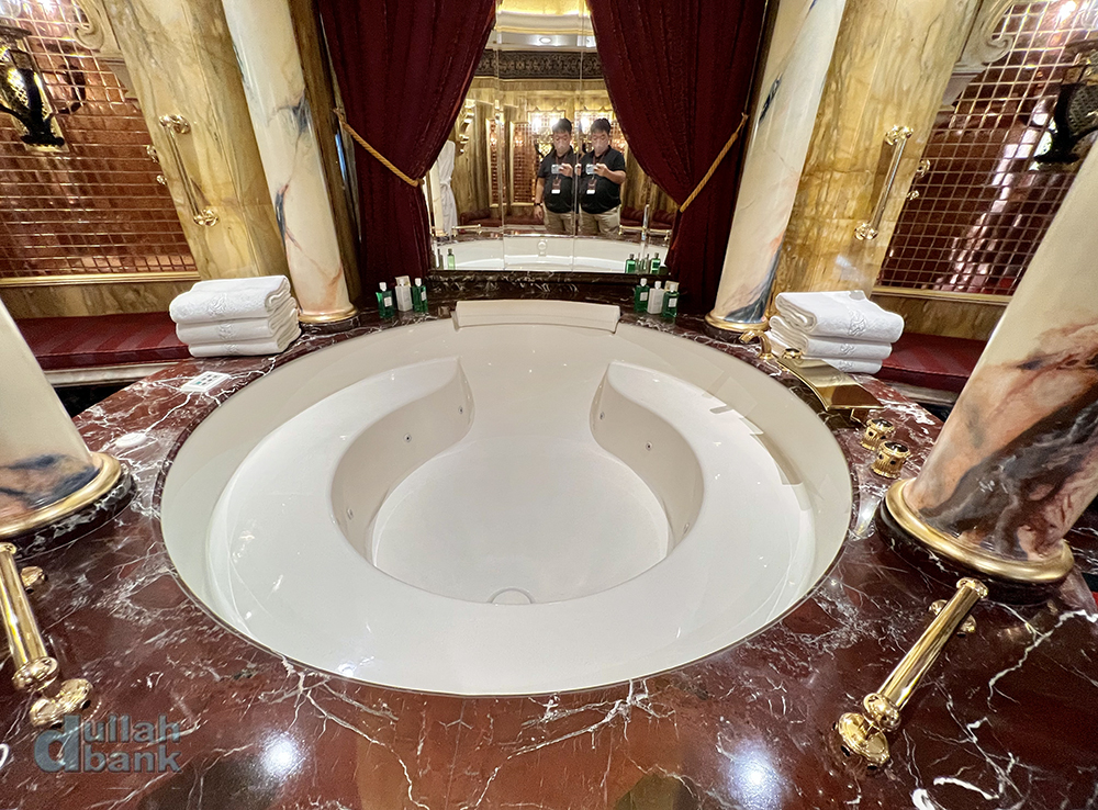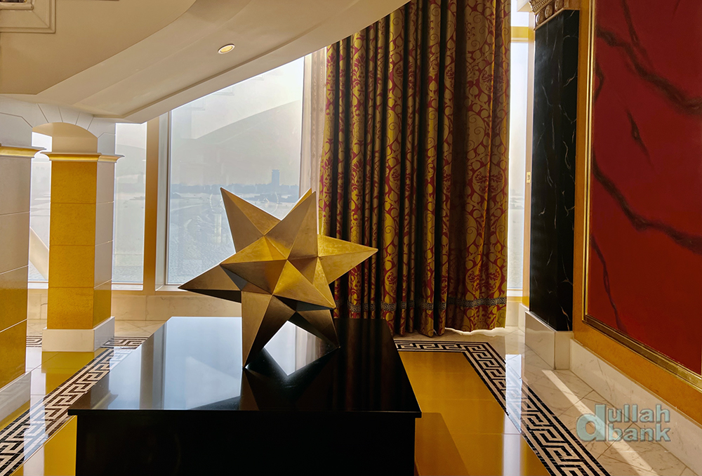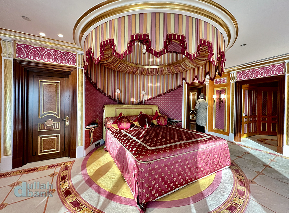 투어객은 엘리베이터 로비 안쪽에 있는 25층 로얄 스위트 (2실)로 연결되는 전용 엘리베이터를 타게 됩니다. 현재 부르즈 알아랍은 202개의 스위트룸 중 199실만 손님을 받고 있으며, 넬슨 만델라 등 VVIP 손님만 받았다는 25층의 로얄 스위트룸은 인사이드 부르즈 알아랍 투어용으로 사용하고, 추가로 1실을 내부용으로 사용 중이라고 하네요. 참고로 로얄 스위트룸 1박 투숙비는 25,000달러.