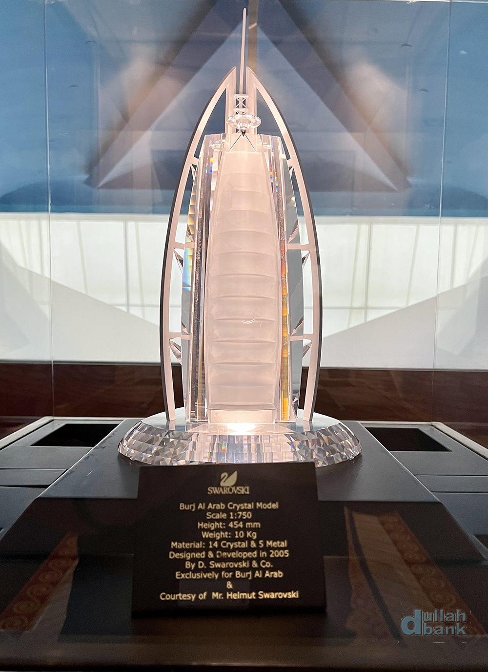 이를 지나쳐 양갈래로 갈라지기 직전 스와로브스키에서 만든 대형 크리스탈 부르즈 알아랍 모형을 만나게 됩니다. 스와로브스키는 호텔 내 식당 Junsui 천장에 은하수를 형상화한 21,000개의 크리스탈을 박았다고 하네요. 이 크리스탈 설치비만 4억원 넘게 들었다는군요.