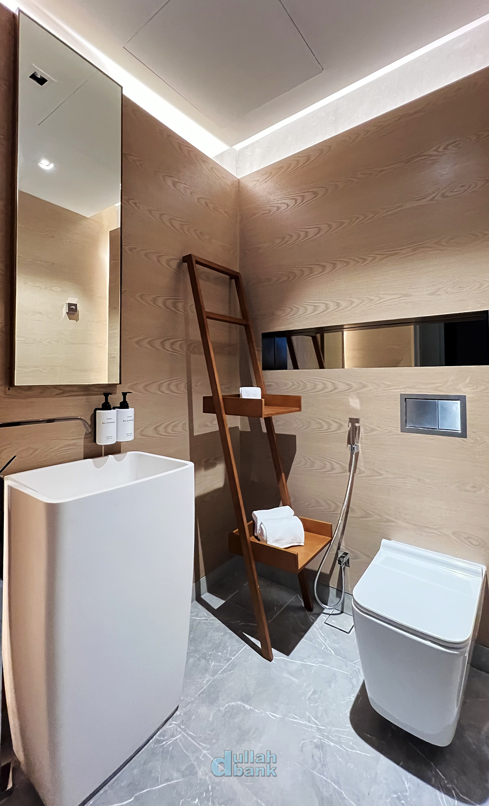 세면대는 세면대에 설치된 거울과 이를 액자처럼 보이게 만드는 대형 전신 거울이 이중으로 배열되어 있습니다.