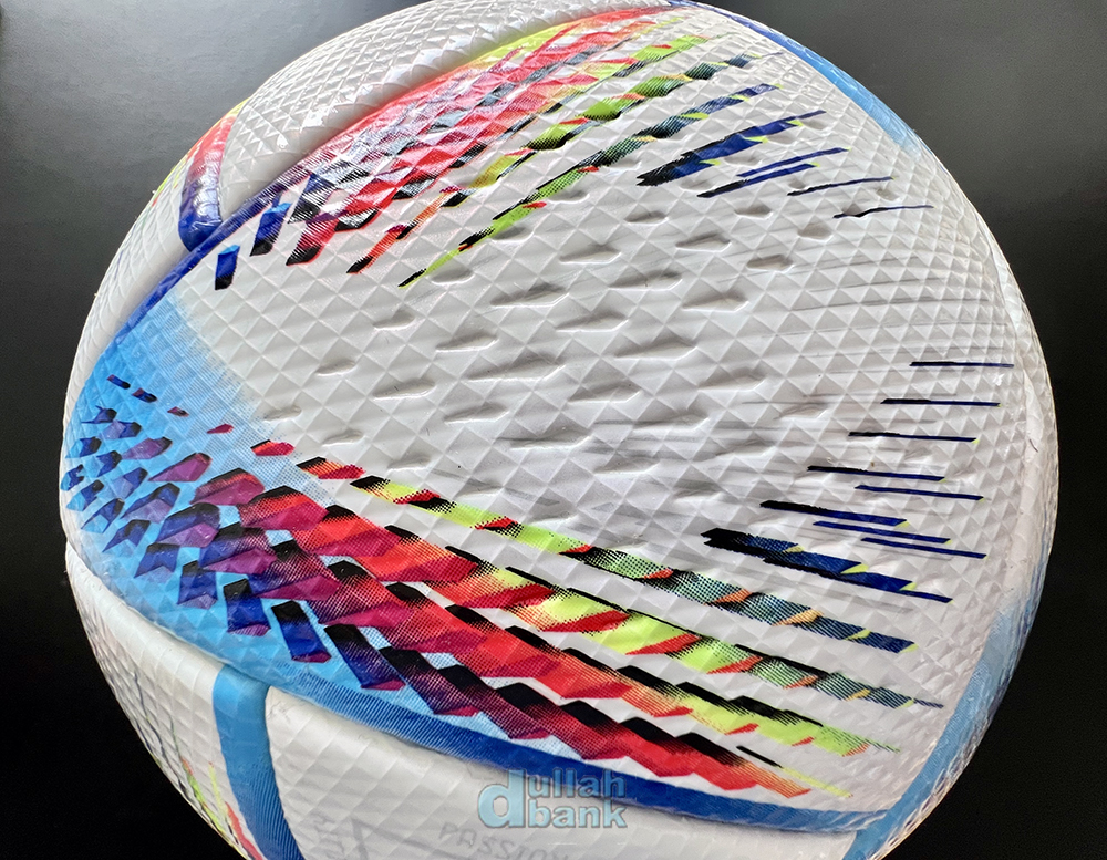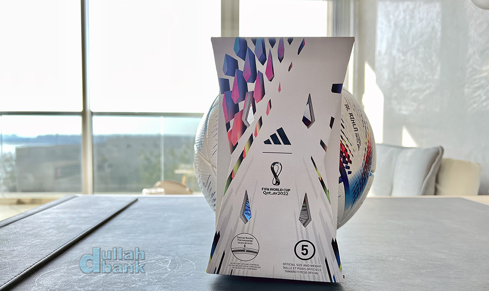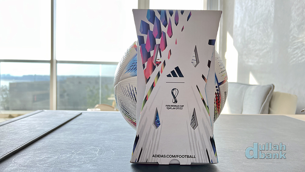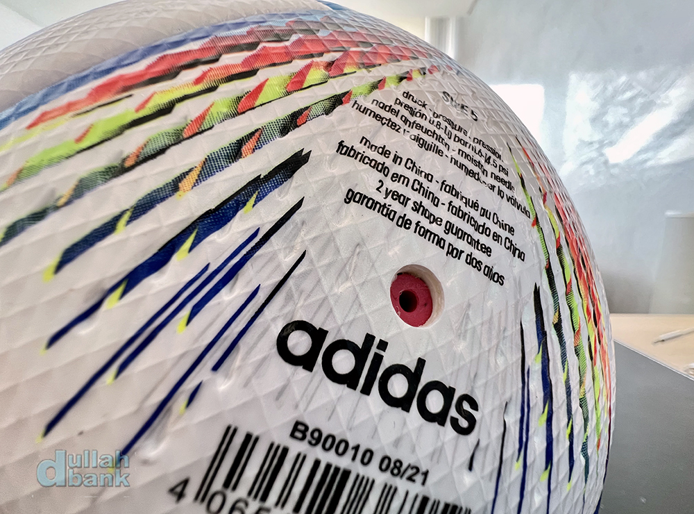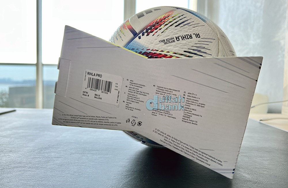 한쪽에는 카타르 월드컵 로고, 아디다스 로고와 함께 써말 본딩으로 접착했다는 설명과 공인구와 같은 크기와 무게의 5호구라는 설명이 있으며,
