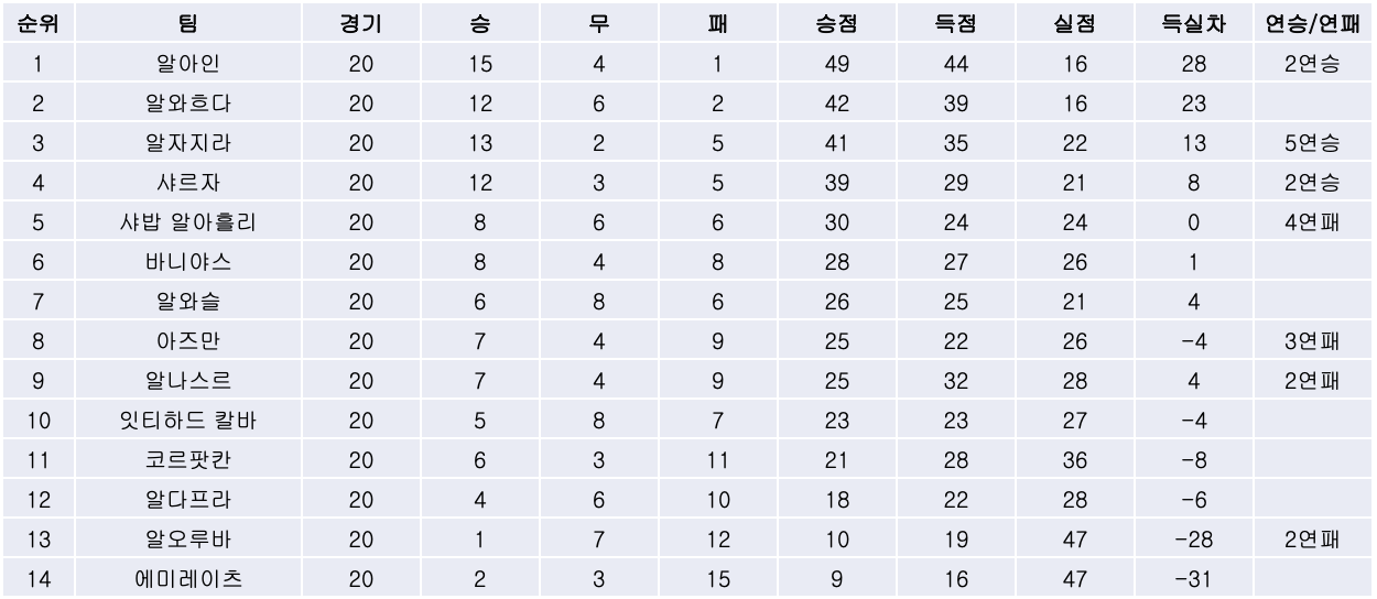 4) 알아인은 알와슬과의 경기에서 라바 코조의 결승골에 힘입어 3대2 승리를 거두고 2위 알와흐다와의 승점차 7점을 유지하며 리그 우승에 한발 더 다가섰습니다.