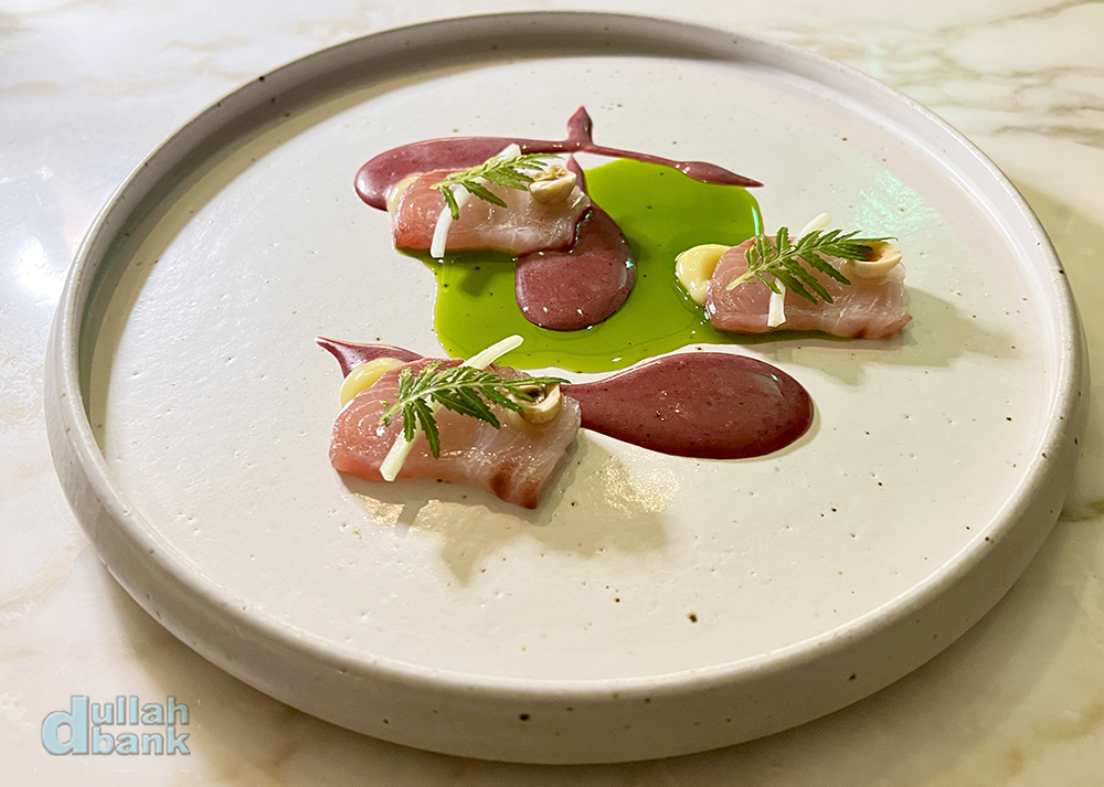 숙성된 방어회에 레몬 스킨 퓨레, 옻나무 쇼유 드레싱, 회향, 딜 오일이 함께 제공됩니다.