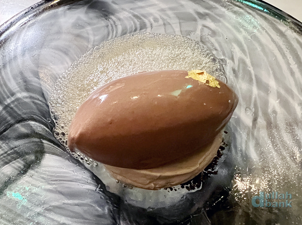 미소가 가미된 다크 초콜렛 소벳에 다크 초콜렛 커피 크럼블이 들어가며 금박이 얹어지는 것이 포인트!