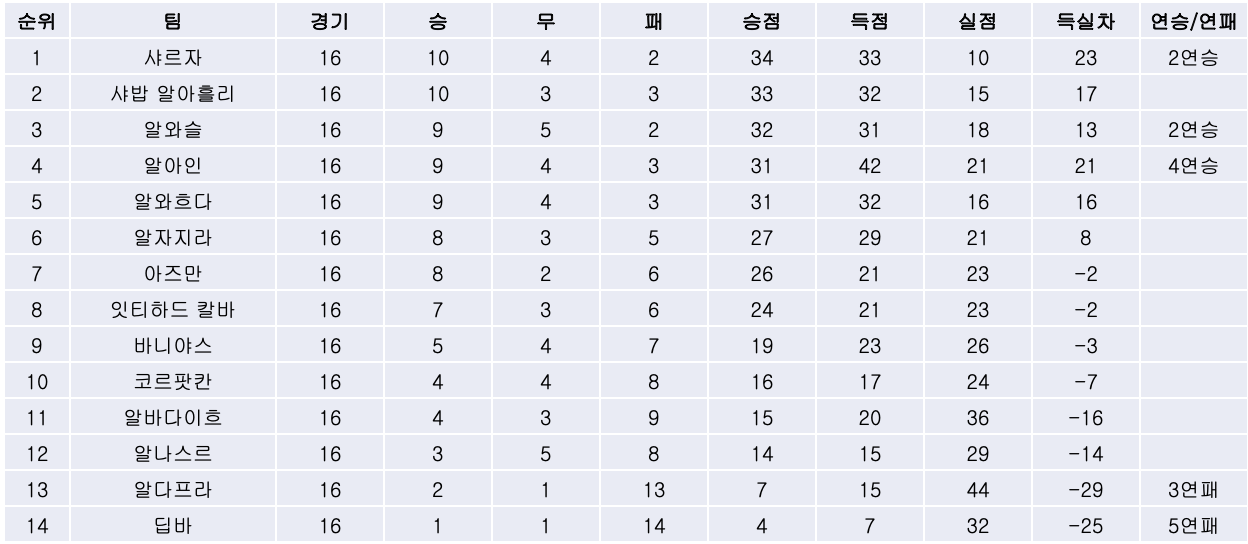 3) 알와흐다와 선두 샤밥 알아흘리의 경기에서는 선제골을 허용하며 리드 당하던 알와흐다가 알라아 주하이르의 동점골로 1대1 무승부를 거두며 승점 1점씩을 나눠가졌습니다. 알와흐다가 무승부에 성공하면서 샤밥 알아흘리는 리그 선두 자리를 샤르자에게 내주었습니다.
