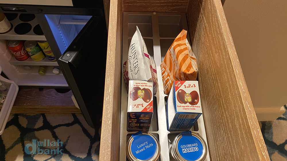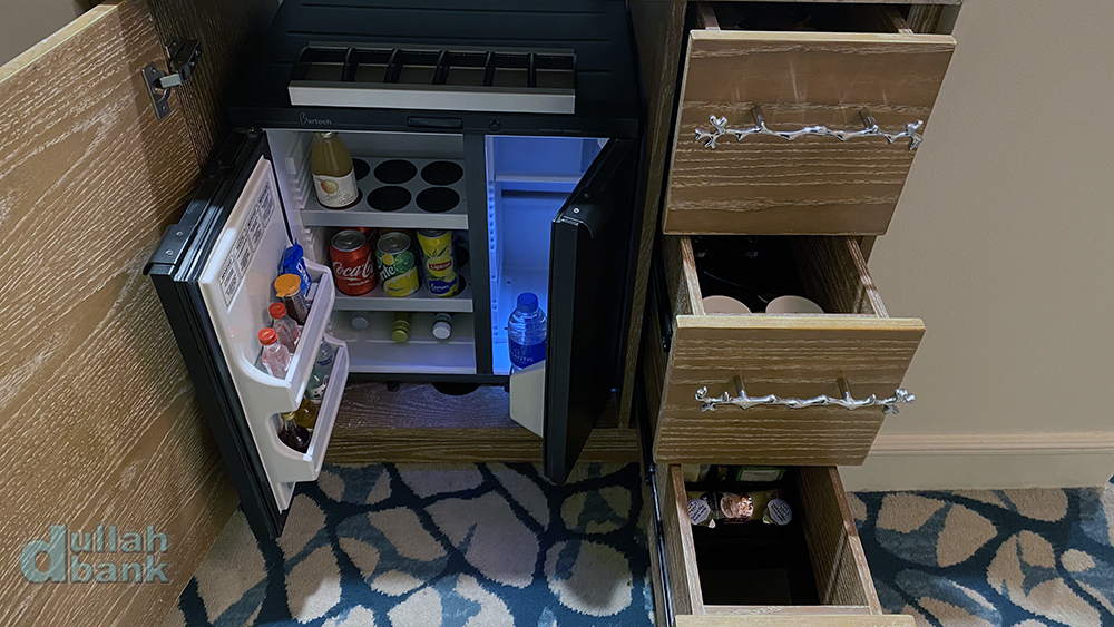 물과 그 흔한 커피머신 대신 전기 주전자만 있었고, 그 밑에는 미니바가 있습니다.