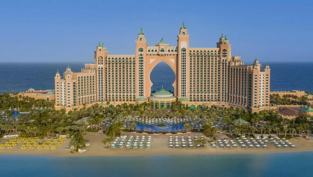 개장 14년차인 아틀란티스 더 팜은 팜 주메이라의 정점이자 중심에 자리잡고 있으며 22층짜리 두 개 동에 일반 룸, 스위트룸, 시그내처 스위트룸을 포함한 1,548 객실을 가지고 있는 초대형 리조트입니다.