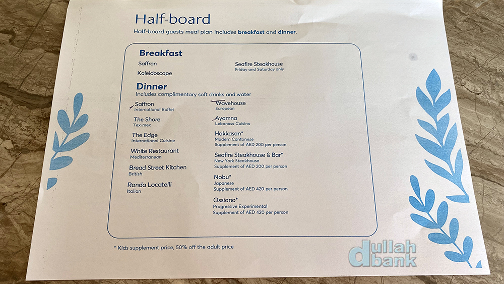 하프보드 투숙객을 위한 안내도 포함되어 있죠. 아침 저녁을 같은 식당에서 제공하는 곳도 있지만, 아틀란티스 더 팜은 선택의 폭이 넓은 대신 투숙비에 포함된 식대 외에 추가요금을 과금하는 레스토랑도 당연히 있습니다.