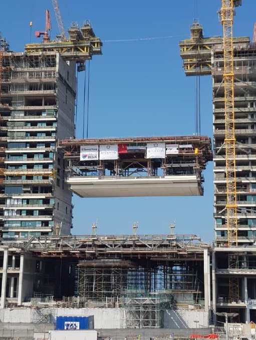 중간중간에 두 건물을 연결하는 45미터 길이의 브릿지를 8대의 유압 잭을 활용해 시간당 6~7미터씩 끌어올린 뒤 연결하는 방식으로 독특한 외관을 만들어나갔다고 하죠.