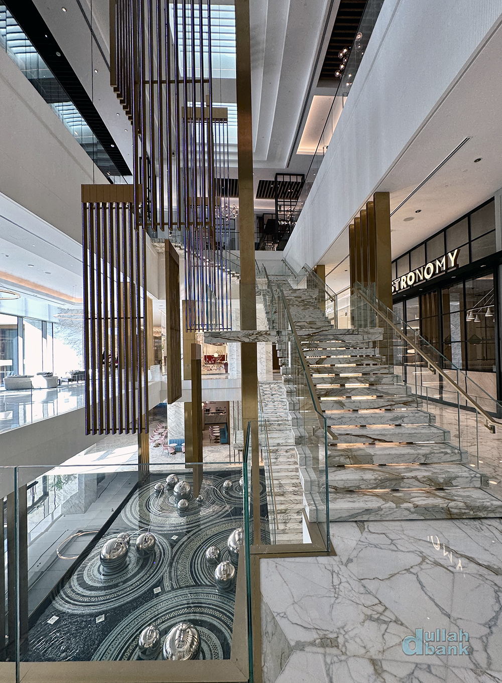 갤러리아 일대에 있는 계단 주위는 플로팅 계단, 수직 조형물, 공, 물의 반사 등을 활용해 단순한 계단이 아닌 하나의 예술작품처럼 보입니다.