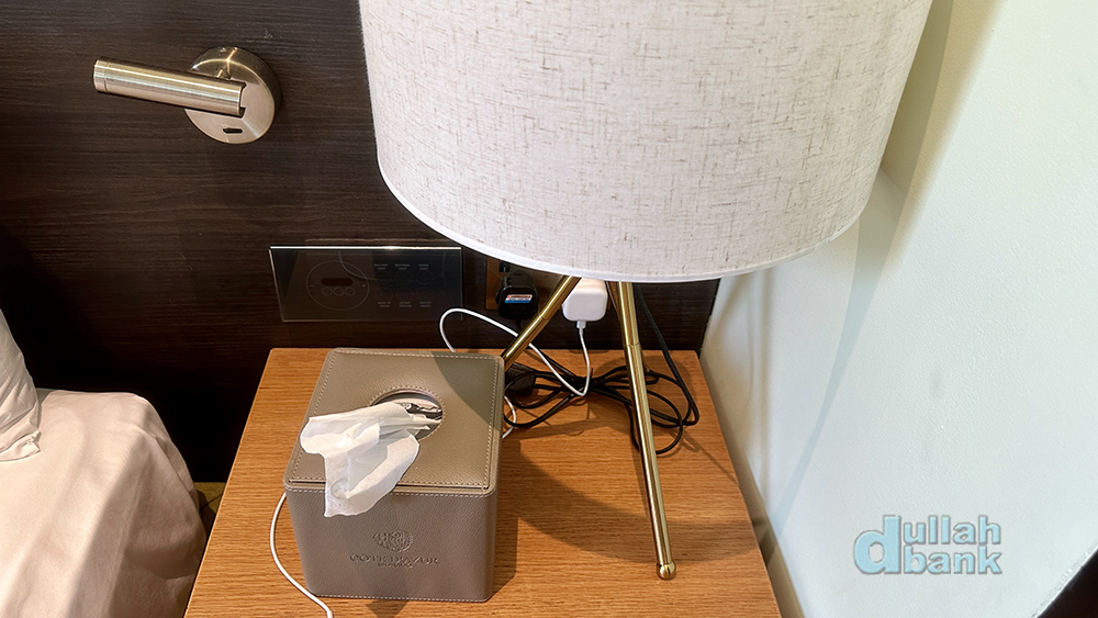 침대 양 옆에는 협탁 대신 벽에 고정된 선반 위에 여러 물품들이 놓여 있습니다.