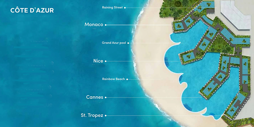 코트다쥐르라는 이름에서 알 수 있듯 프랑스 남동부 지중해 해안 지역에 영감을 받은 4개의 호텔로 이루어진 리조트로 각 호텔의 이름은 코트다쥐르에서 유명한 동네인 모나코 (Monaco), 니스 (Nice), 칸느 (Cannes), 생트로페 (St. Tropez)이라 명명되었으며, 코트다쥐르 리조트에서 처음이자 하트 오브 유럽 내에서도 처음으로 모나코 호텔이 작년 말부터 운영에 들어갔습니다. 이 동네 특성상 "소프트 오프닝"이란 이름으로 가능한 곳부터 열고 보는 거죠.