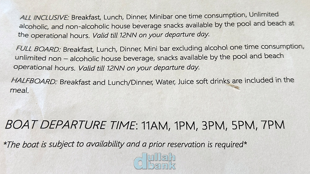 리조트로 가는 배는 매 두 시간마다 있어 사전에 예약을 해야 됩니다. 리조트로 가는 배는 짝수 시각 정시 (2시, 4시, 6시...), 육지로 돌아오는 배는 홀수 시각 정시 (11시, 1시, 3시...).