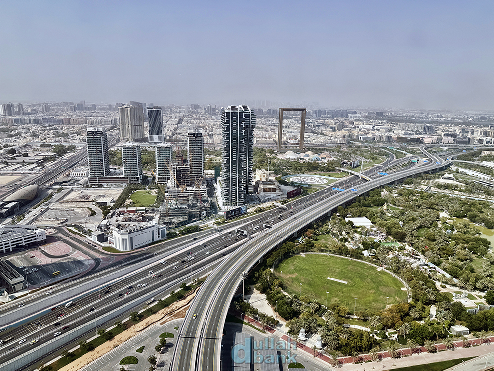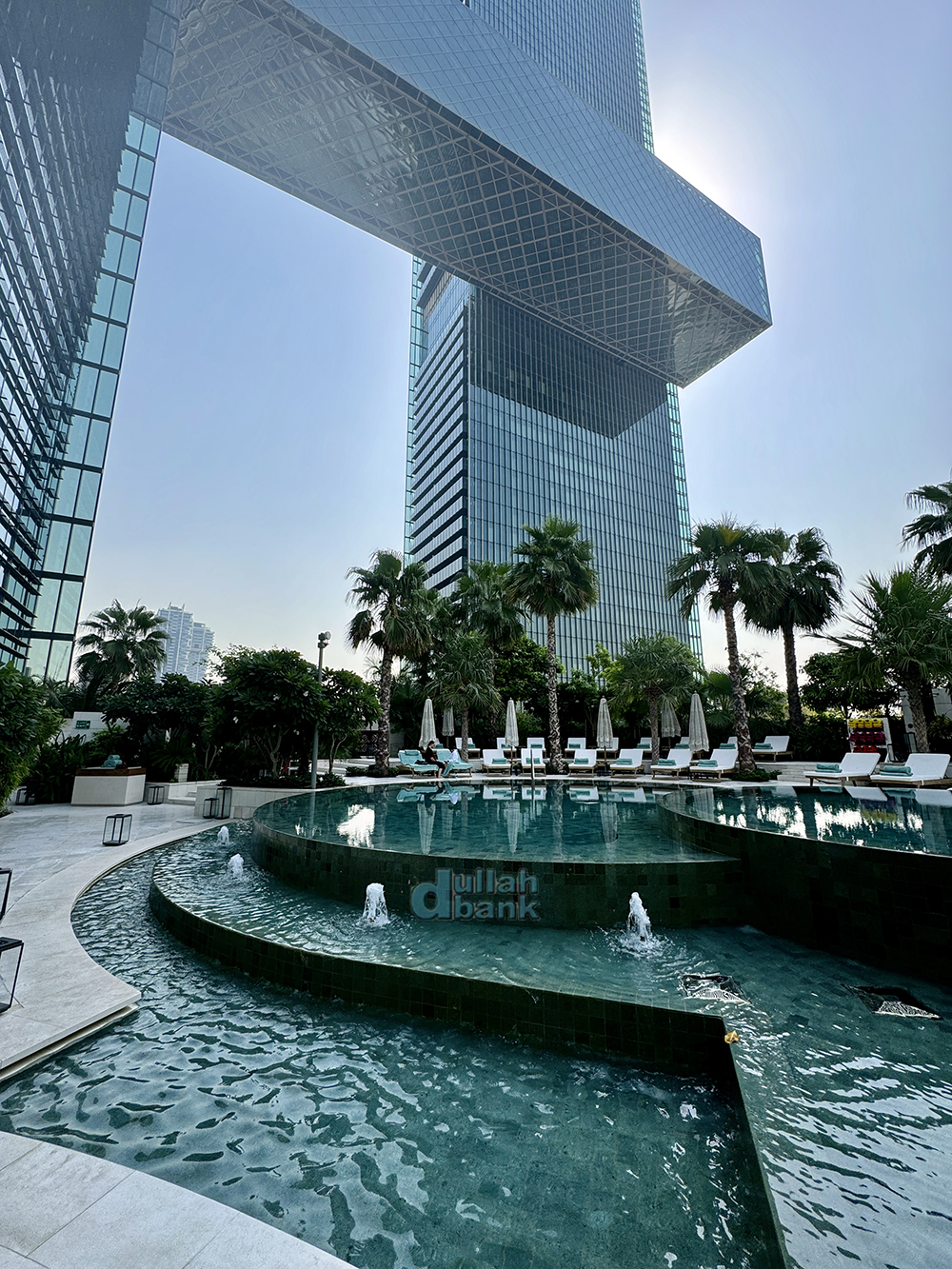 로비에서 바라보는 두바이 신도심. 바로 맞은편엔 두바이 월드트레이드 센터와 전시장. 그 너머에는 세로축으로 뻗어있는 셰이크 자이드 로드의 스카이 라인과 함께, 가로축으로 벌려지는 DIFC, 다운타운 두바이, 비즈니스 베이 일대의 스카이 라인을 감상할 수 있습니다.