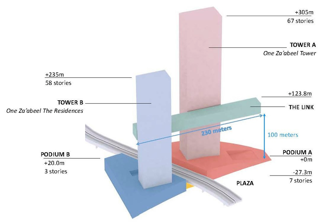 원 자빌은 원 자빌 타워 (A동 67층 높이 305m), 원 자빌 레지던스 (B동 58층 높이 235m)의 초고층 건물 두 동과 지상 100미터 위에서 두 타워를 연결하는 더 링크 (5층 높이 23.8m)의 세 건물로 이루어진 주상복합단지입니다.