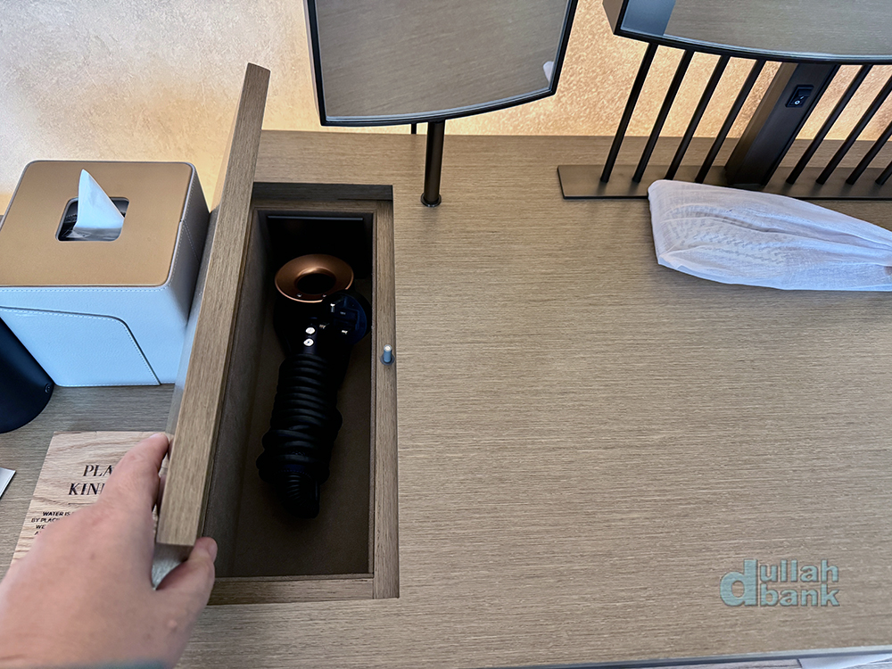 테이블의 유일한 수납 공간에는 헤어 드라이어가 이미 자리잡고 있습니다.
