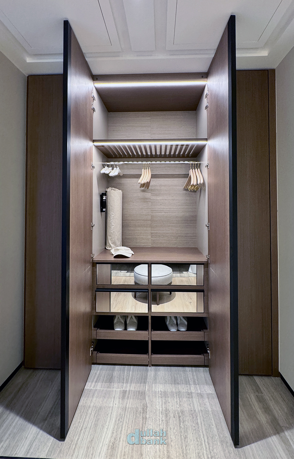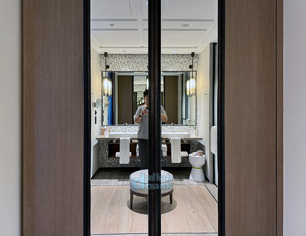 옷장을 비롯한 각종 수납 공간을 일반적인 호텔처럼 별도의 공간으로 빼지 않고 화장실 내 세면대 맞은 편에 두었기 때문입니다.