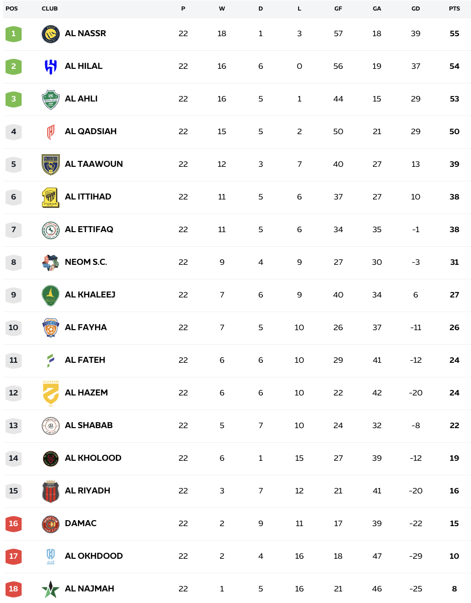 10) 6연승을 달리며 알힐랄을 바짝 뒤쫓고 있는 알나스르와 알하즘의 경기에서는 크리스티아누 호날두의 결승골을 앞세운 알나스르가 4대0으로 승리하며 7연승을 달리고, 알잇티하드와 비긴 알힐랄을 제치고 선두를 탈환했습니다.