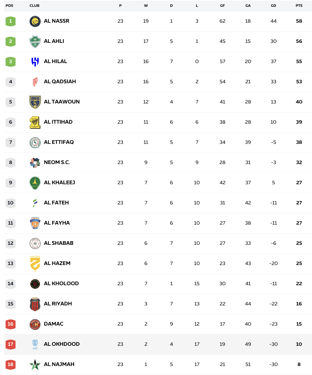 11) 7연승을 달리며 지난 라운드에 선두를 탈환했던 알나스르는 크리스티아누 호날두의 결승골을 시작으로 다섯골을 몰아넣으며 최하위 알나즈마를 0대5로 대파하고 8연승을 달리며 선두를 질주했습니다. 결승골을 넣은 호날두는 시그내처인 시우 세리머니 대신 새로운 슬램덩크 세리머니를 선보여 화제를 모았습니다.